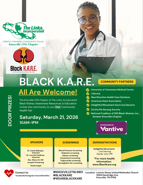 The Chapter will host a community health fair on Saturday, March 1, 2025, from 10:00 A.M. until 2:00 P.M. at the Change Center Knoxville, 203 Harriet Tubman Street, Knoxville, Tennessee 37915. Medical and healthcare professionals will discuss chronic kidney disease, how it affects the body, and what steps can be taken to slow its progression. There will be free screenings for diabetes, blood pressure, kidney disease, carotid ultrasound, lung function test, and more. This event is free and open to the public. Registration will be at the door on the day of the event. #blackkare, #weareblackkare.